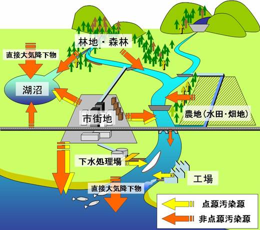 湖沼への負荷は、主に外部負荷(流入負荷)と内部負荷に分けられる。外部負荷には点源負荷とノンポイント負荷がある。また、降雨や養殖などによる直接負荷も考慮する必要がある。