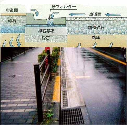 ・街渠の表面下にフィルターを有する排水溝を設け、道路面や民地より流出した雨水をこの排水溝に集水します。